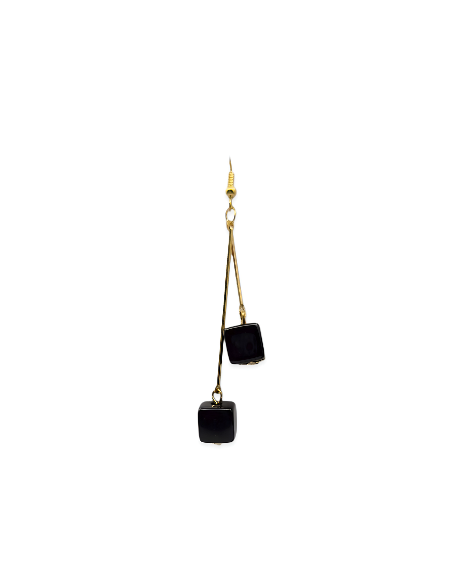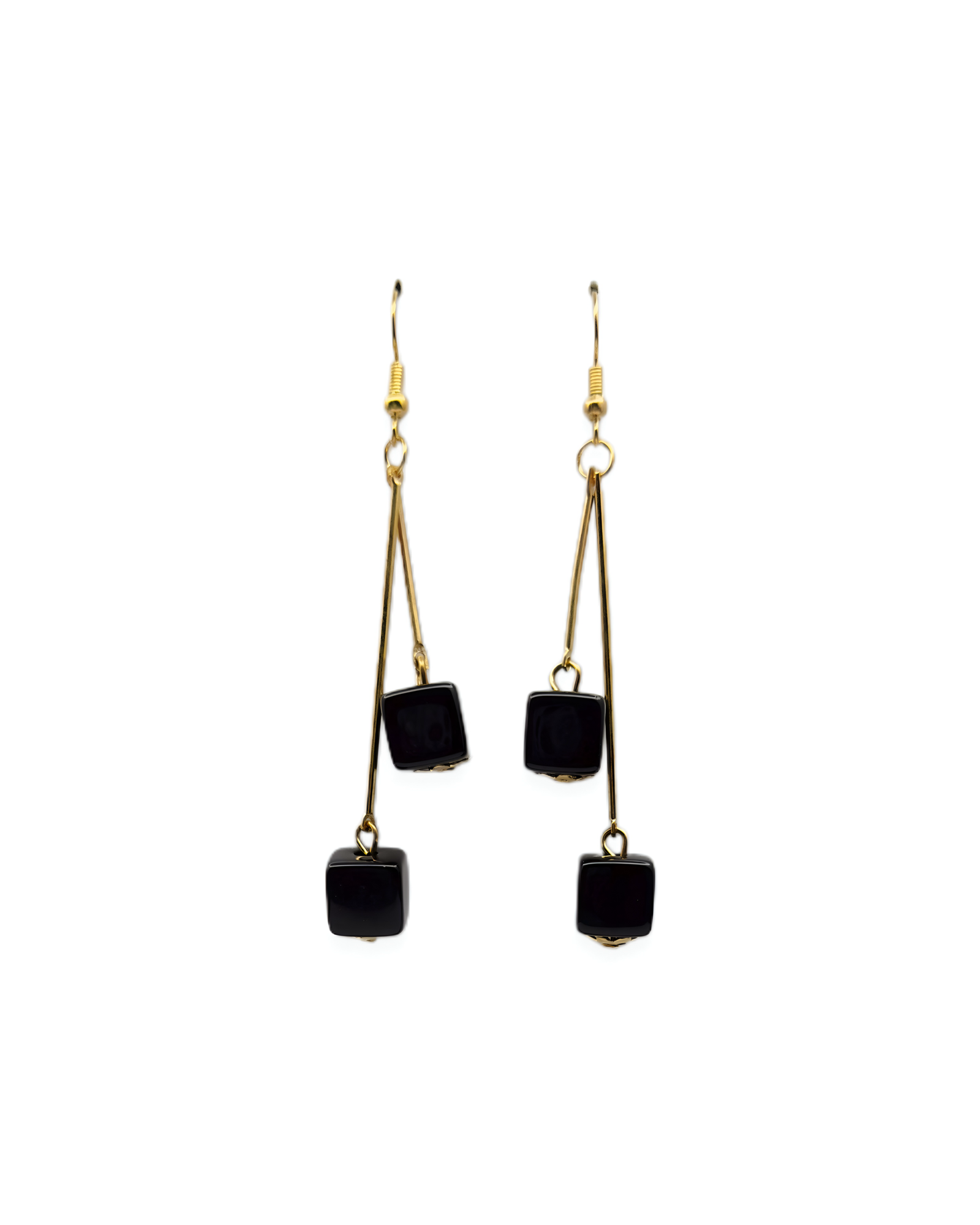 Design: Contemporary long drop earrings featuring glossy black cube beads suspended from slim gold-tone bars for a clean geometric silhouette.