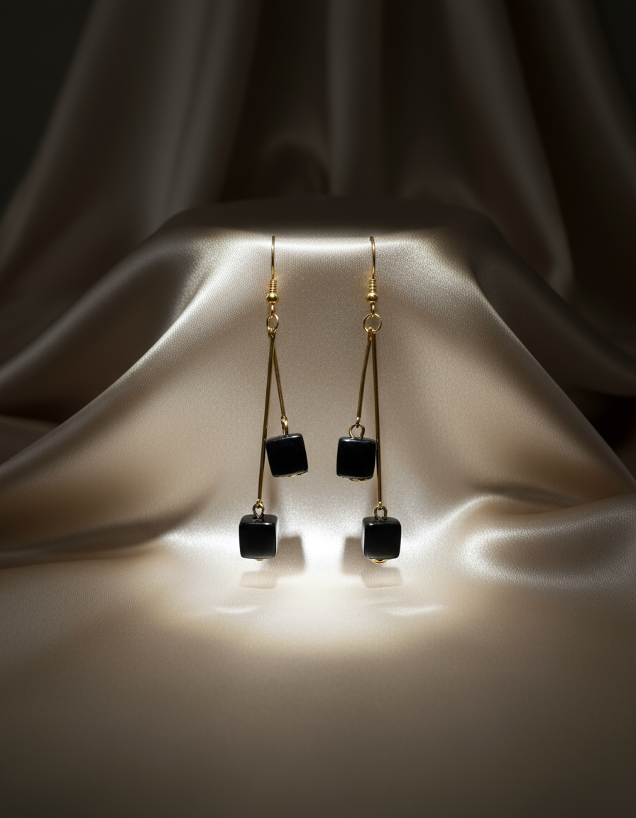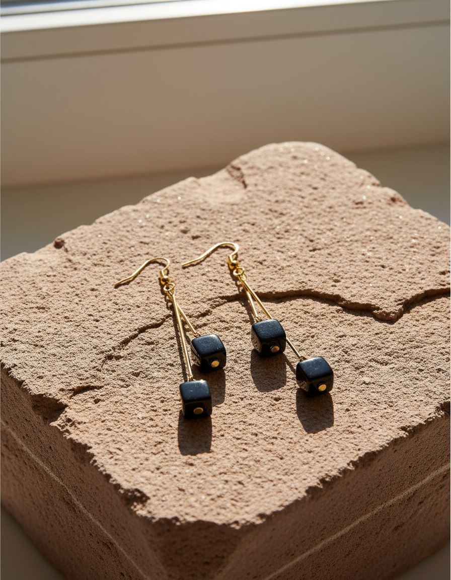 Color: Deep black cubes contrasted with warm gold-tone metal for a bold, versatile combination that matches most outfits.