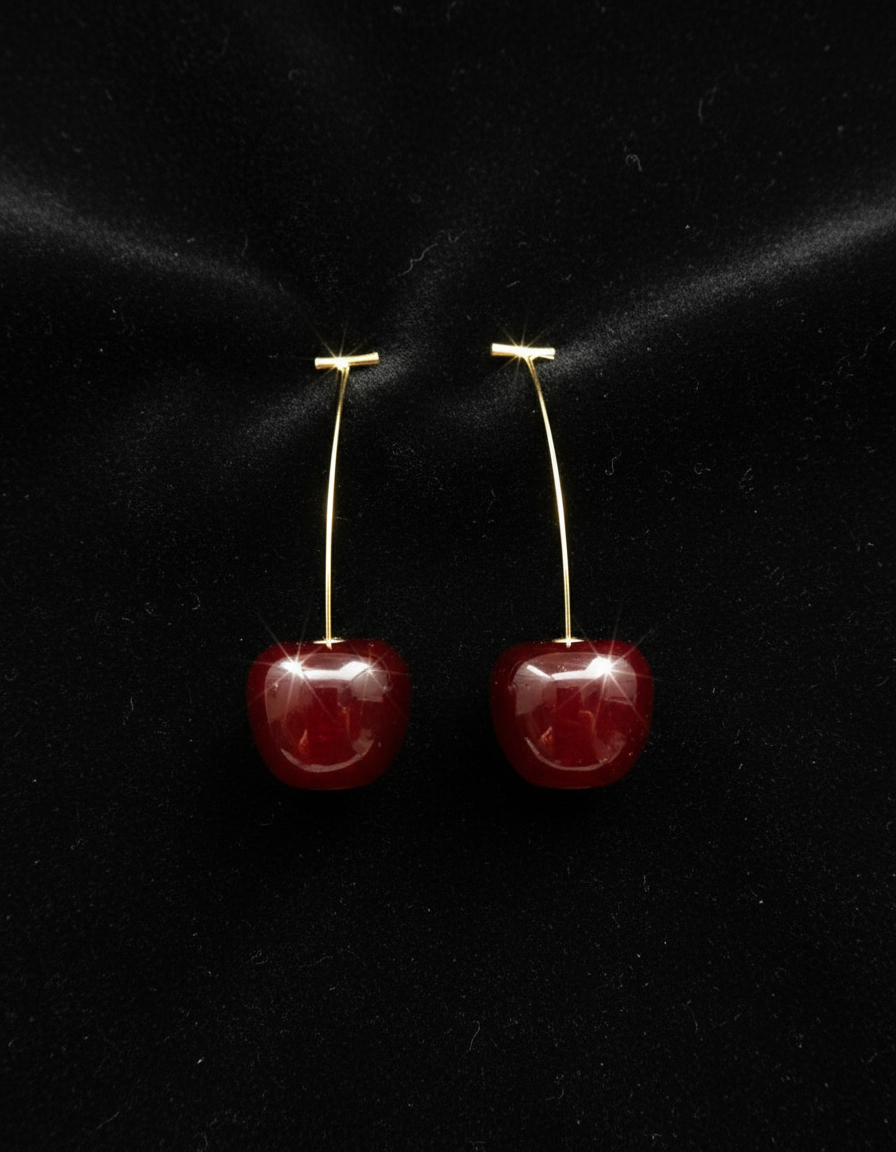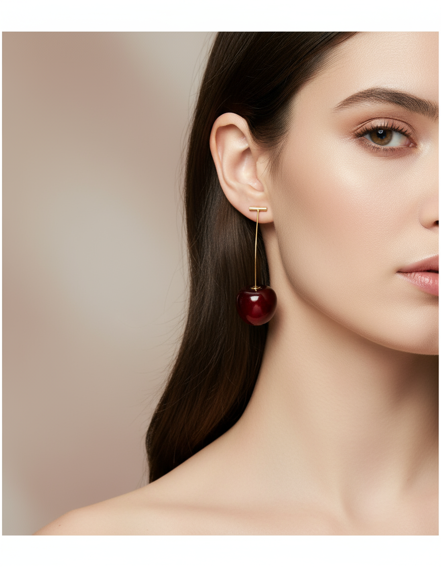 Design: Cute cherry-shaped red drop earrings with a minimalist long gold hook design that elongates the neck and frames the face beautifully.