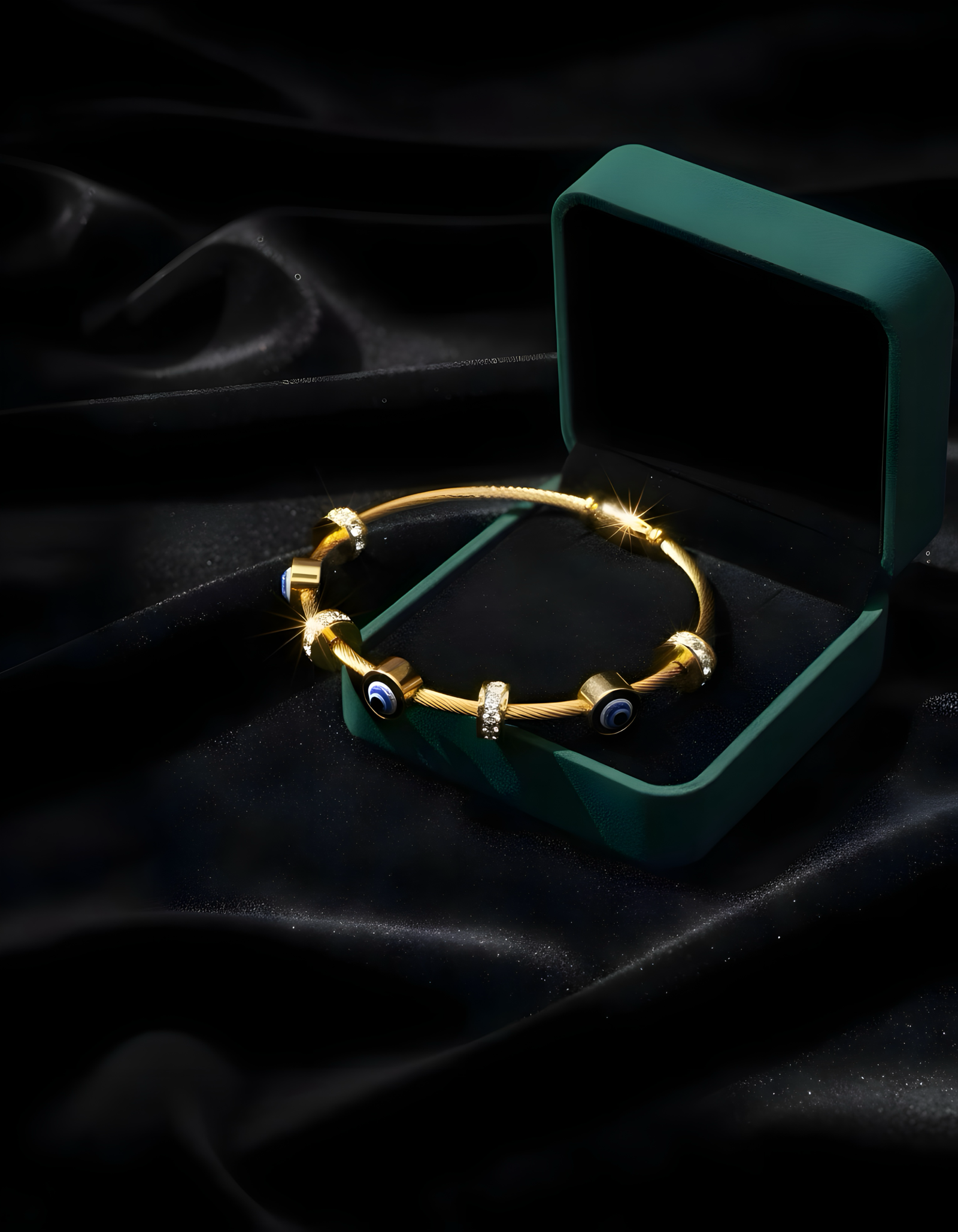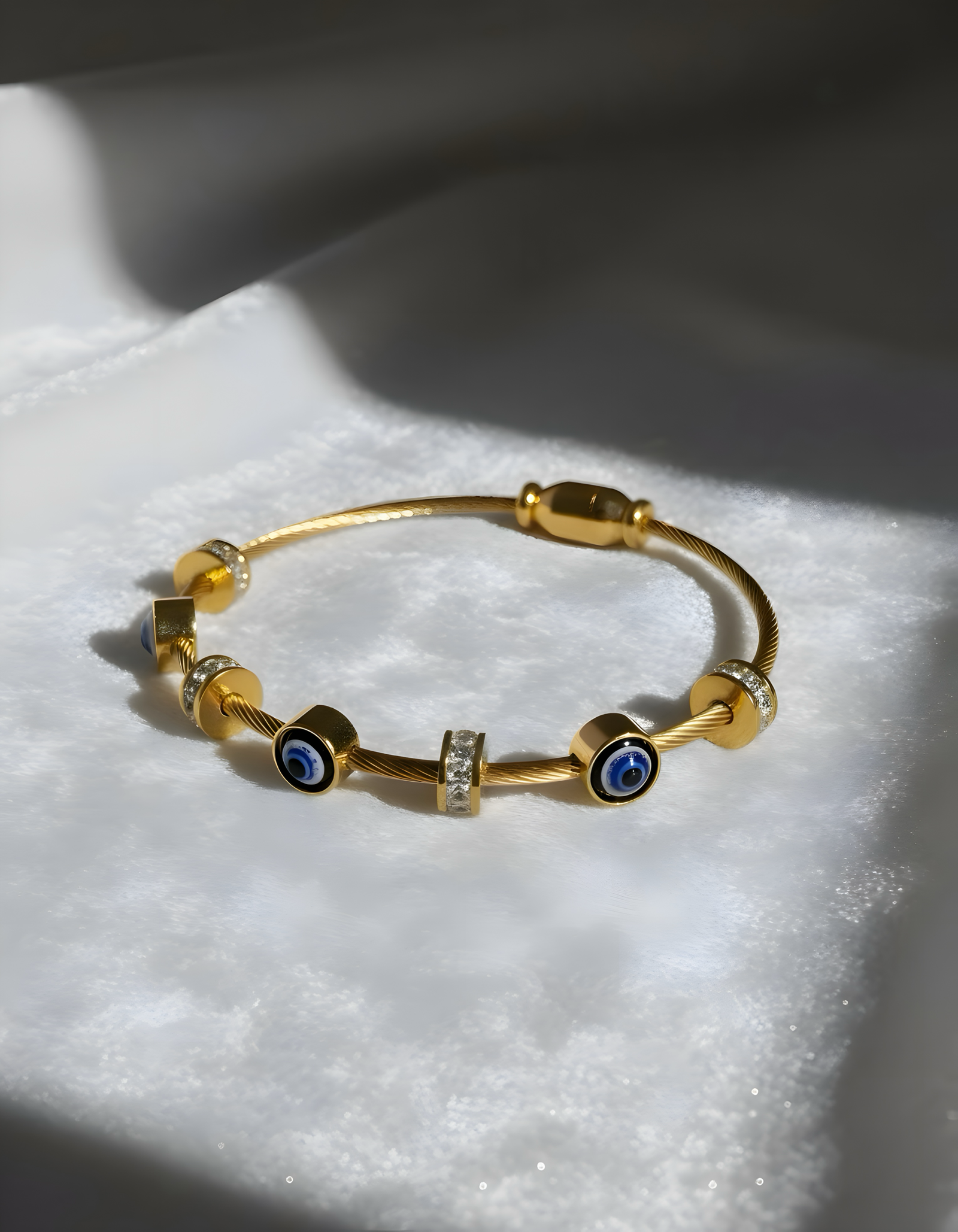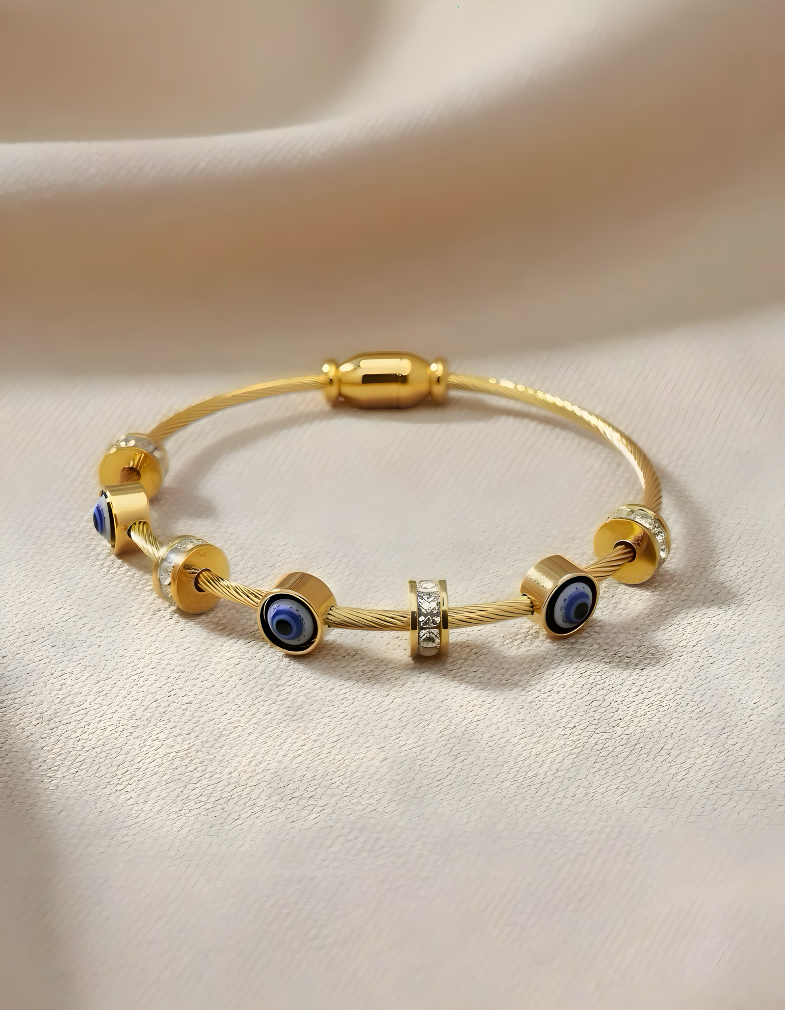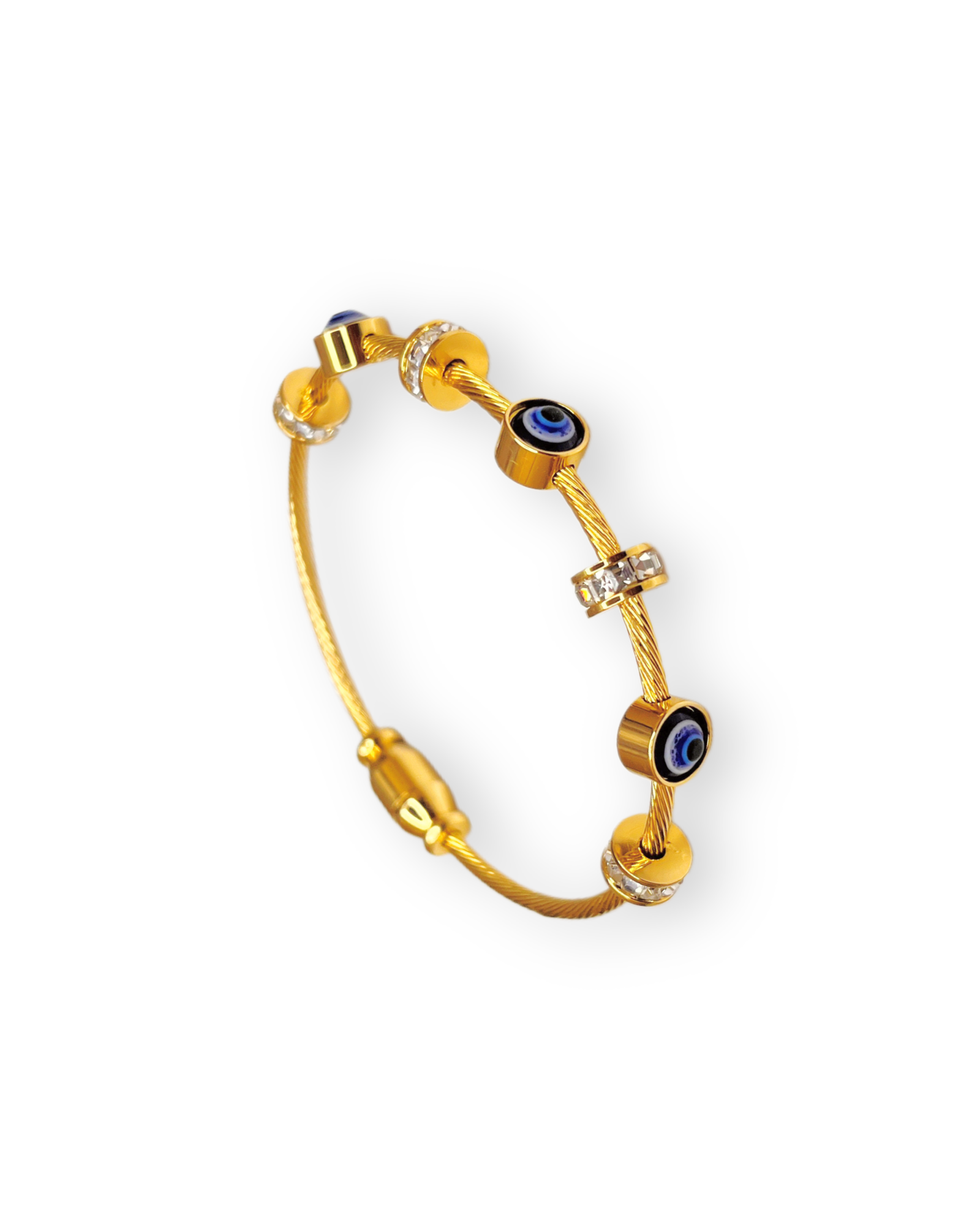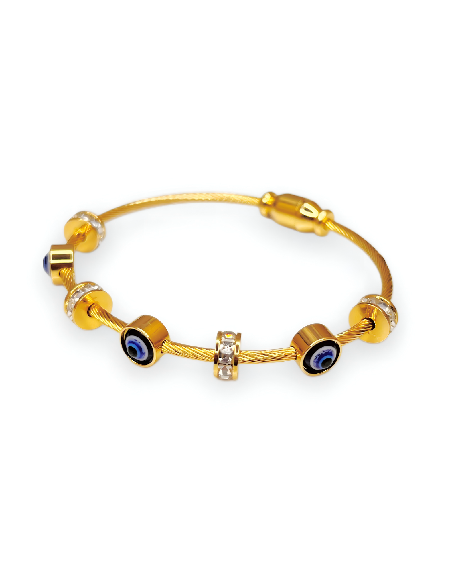 Material: Fashion jewelry made from alloy cable with gold-tone plating, enamel evil eye beads, and clear crystal accents.