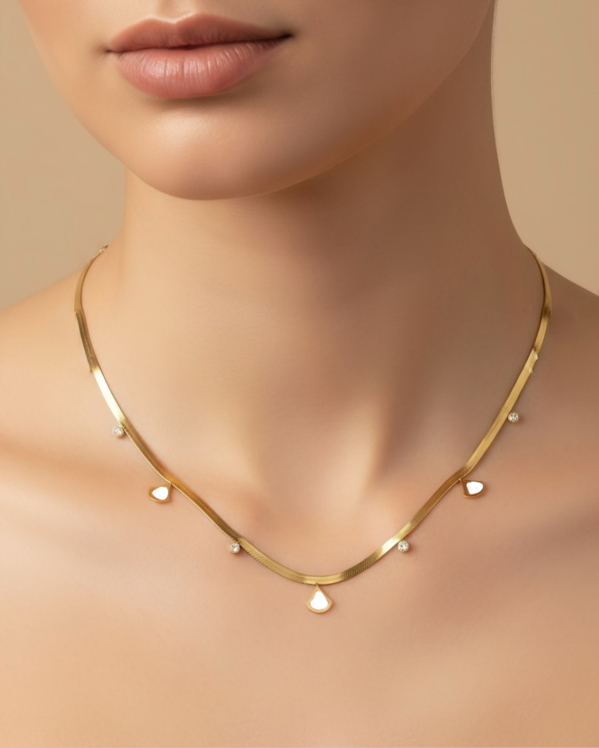 Its fluid silhouette rests elegantly along the neckline, making it an ideal piece for both contemporary and traditional styling. Whether paired with festive wear, formal attire, or elevated everyday looks, this necklace adds a soft glow and timeless charm to any ensemble.