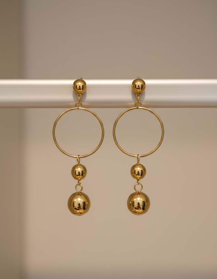Design: Polished gold-tone stud with open hoop and two graduating ball charms, giving a clean geometric silhouette and fluid movement.